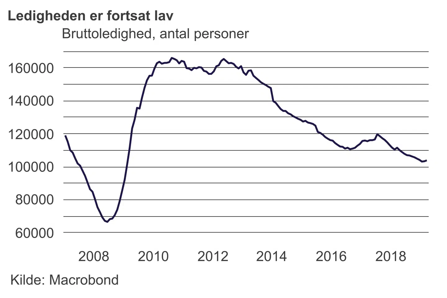Tallene for væksten kom samtidig med nye tal for ledigheden. De viser, at antallet af burttoledige i maj faldt med 500 personer til 102.500. Det fald var dog så lille, at ledighedsprocenten ligger på 3,7 pct. for sjette måned i træk.
