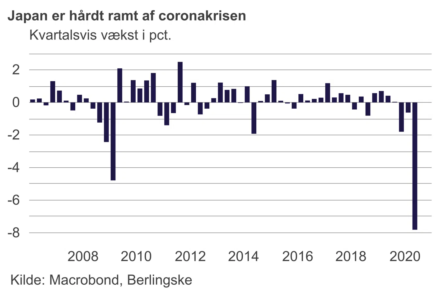 I årets andet kvartal skrumpede den japanske økonomi således med 7,8 procent – det største dyk nogensinde siden statistikkens begyndelse i 1980. På årsbasis svarer BNP-faldet til et dyk på 27,8 procent. Til sammenligning lød den årlige nedgang på 17,8 procent i 2008, da finanskrisen brød ud i lys lue, skriver Reuters.