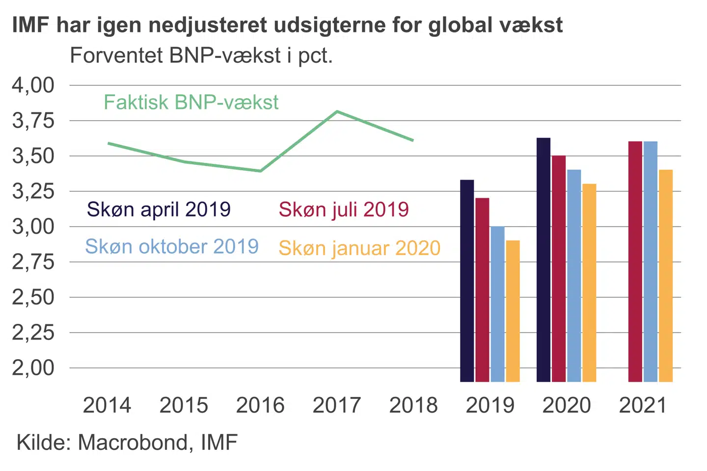 Det går trods alt fremad. Det er konklusionen i den netop offentliggjorte vækstprognose fra Den Internationale Valutafond, IMF, i Washington. Ifølge den globale vagthund ramte den globale vækst bunden i 2019, men der venter ikke en bragende højkonjunktur forude. IMF har faktisk nedjusteret sin prognose i forhold til i oktober, hvor handelskrigen mellem USA og Kina var på sit højeste.