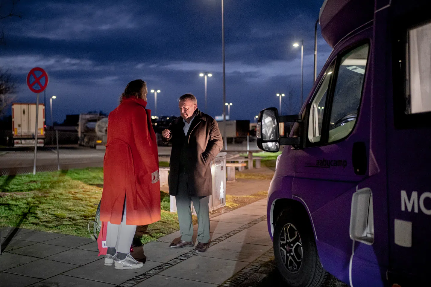 På en rasteplads mellem Sjælland og Jylland holder Lars Løkke Rasmussen og Moderaternes valgkamp en kort pause. Helbredet er i bund, og han hoster højlydt. Dårlig timet influenza. Løkke udveksler et par ord med rådgiver Ulla Østergaard, inden turen går videre mod Kolding. Foto: Asger Ladefoged