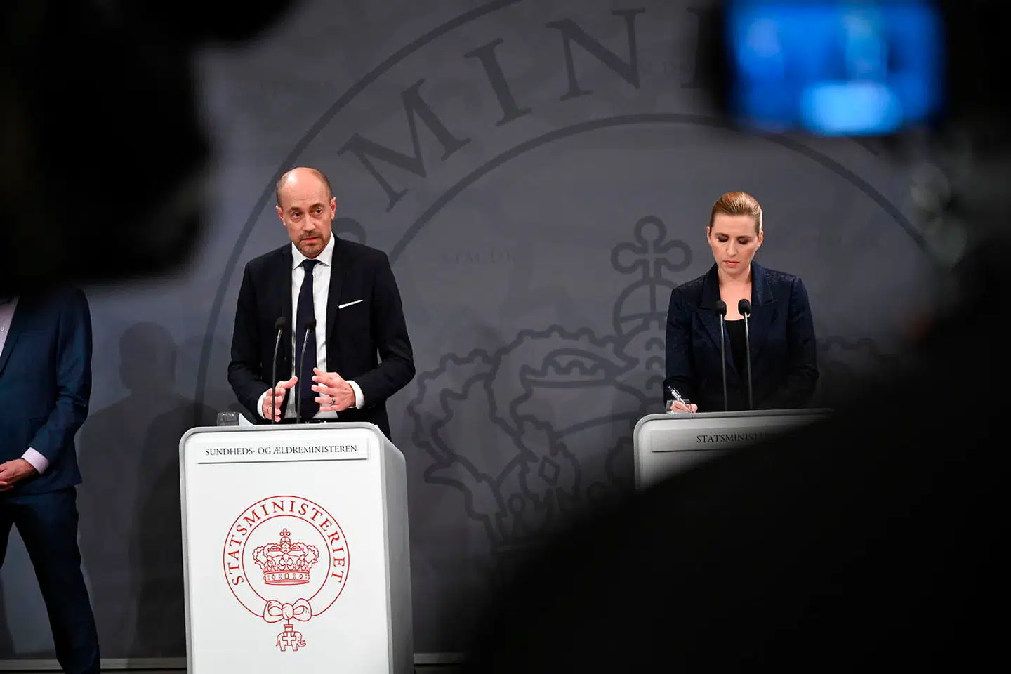 Mette Frederiksen var på pressemødet flankeret af sundheds- og ældreminister Magnus Heunicke (S), direktør i Sundhedsstyrelsen Søren Brostrøm, rigspolitichef Thorkild Fogde samt Erik Brøgger Rasmussen, der er direktør for Organisation og Borgerservice i Udenrigsministeriet.