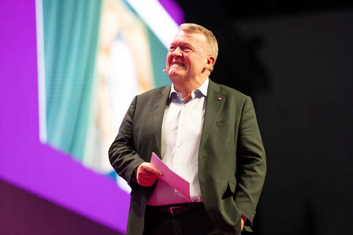 Lars Løkke Rasmussen (M) kører helt op til kongeværelset i lufthavnen i ministerbilen og kommer ind ad glasdørene med et lidt stresset udtryk.