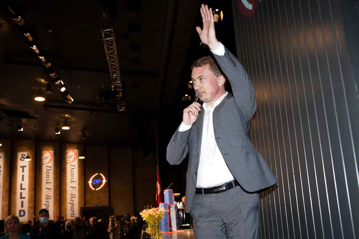 Kristian Thulesen Dahl holder sin tale på årsmødet fra Messecenter Herning, selvom årsmødet holdes i Kongrescenter Herning. Det skyldes, at Kristian Thulesen Dahl i øjeblikket ikke har noget coronapas, fordi han for nylig har været smittet.