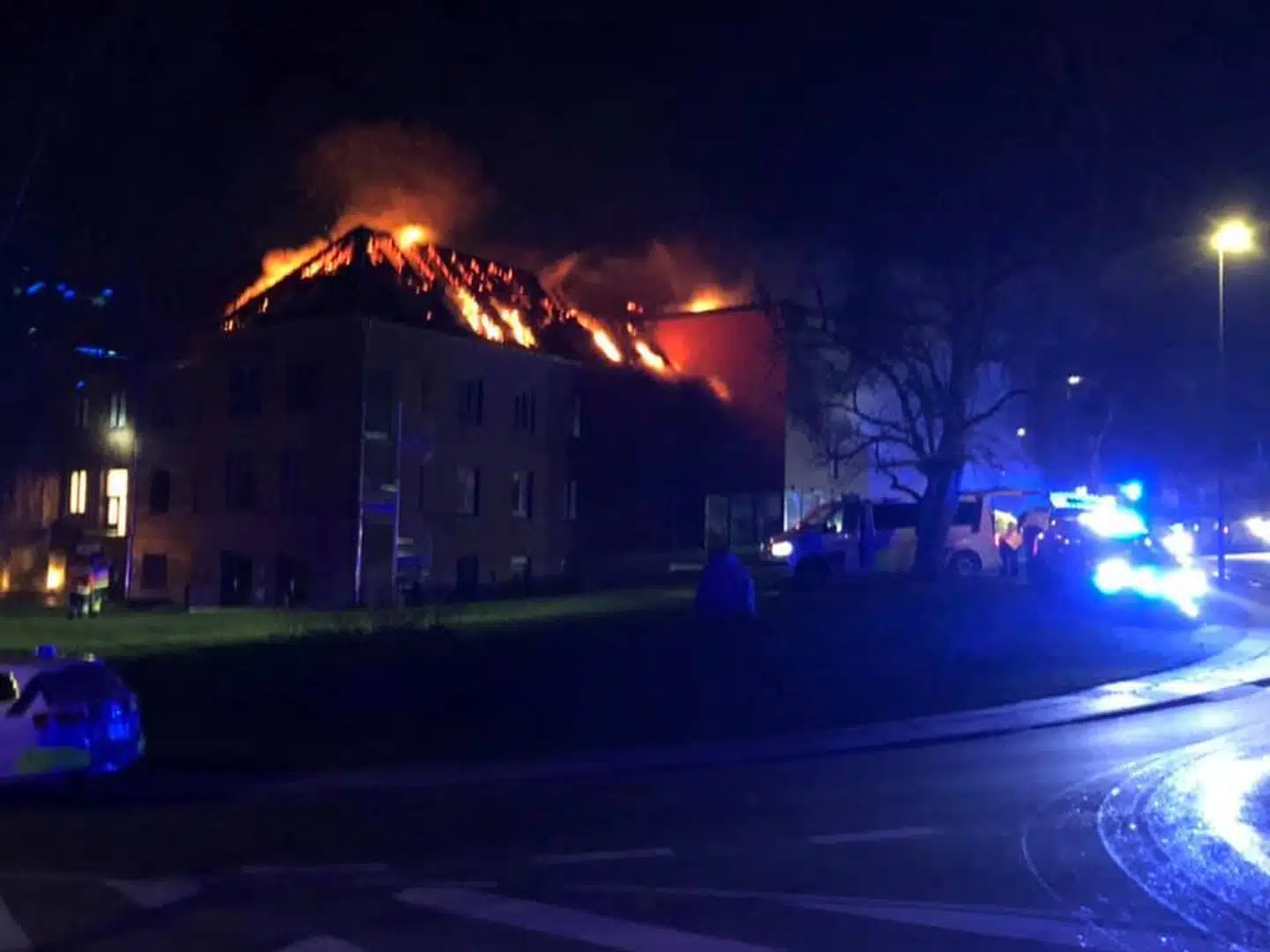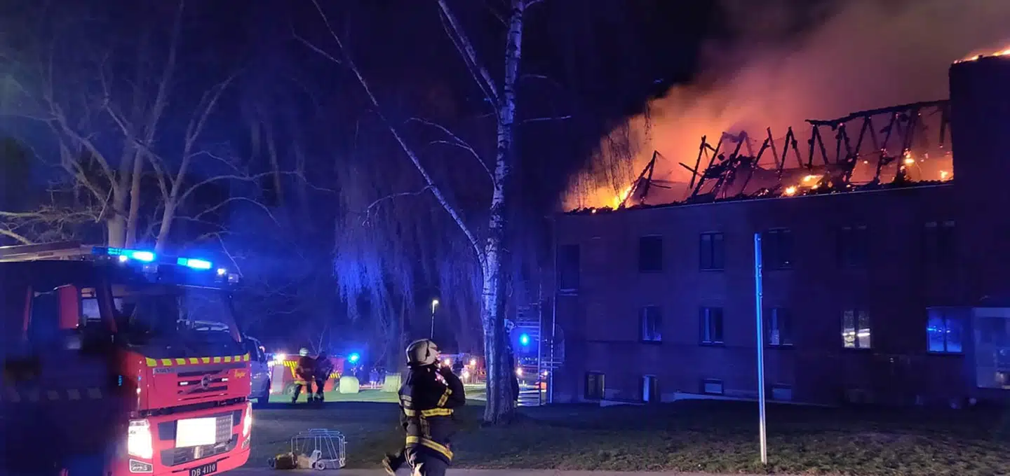 Han kan ikke sige noget om, hvor stor en del af skolen der står i flammer.
