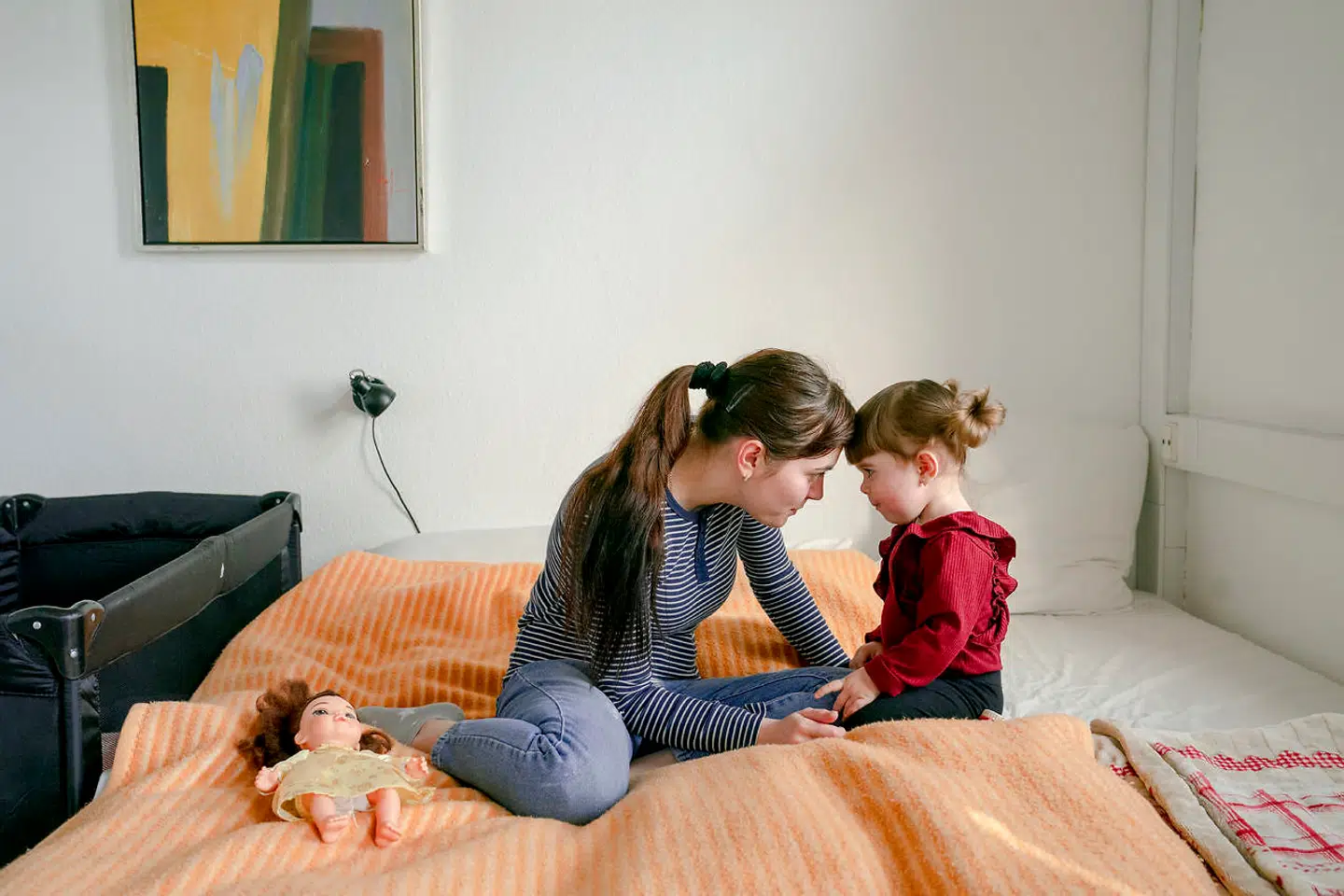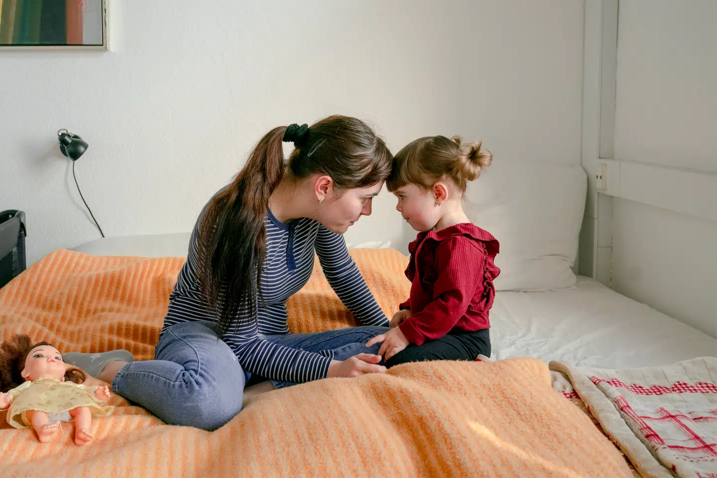 Alona Kuzmenko (billedet herunder) og hendes halvandet år gamle datter, Bozhena, flygtede fra regionen Zhytomyr i det nordvestlige Ukraine. Området har været beskudt med missiler siden krigens første dag. Alona boede i en landsby tæt ved et brændstofdepot. Da hun så missiler flyve henover landsbyen, frygtede hun, at brændstofdepoterne ville bryde i brand, fortæller hun.