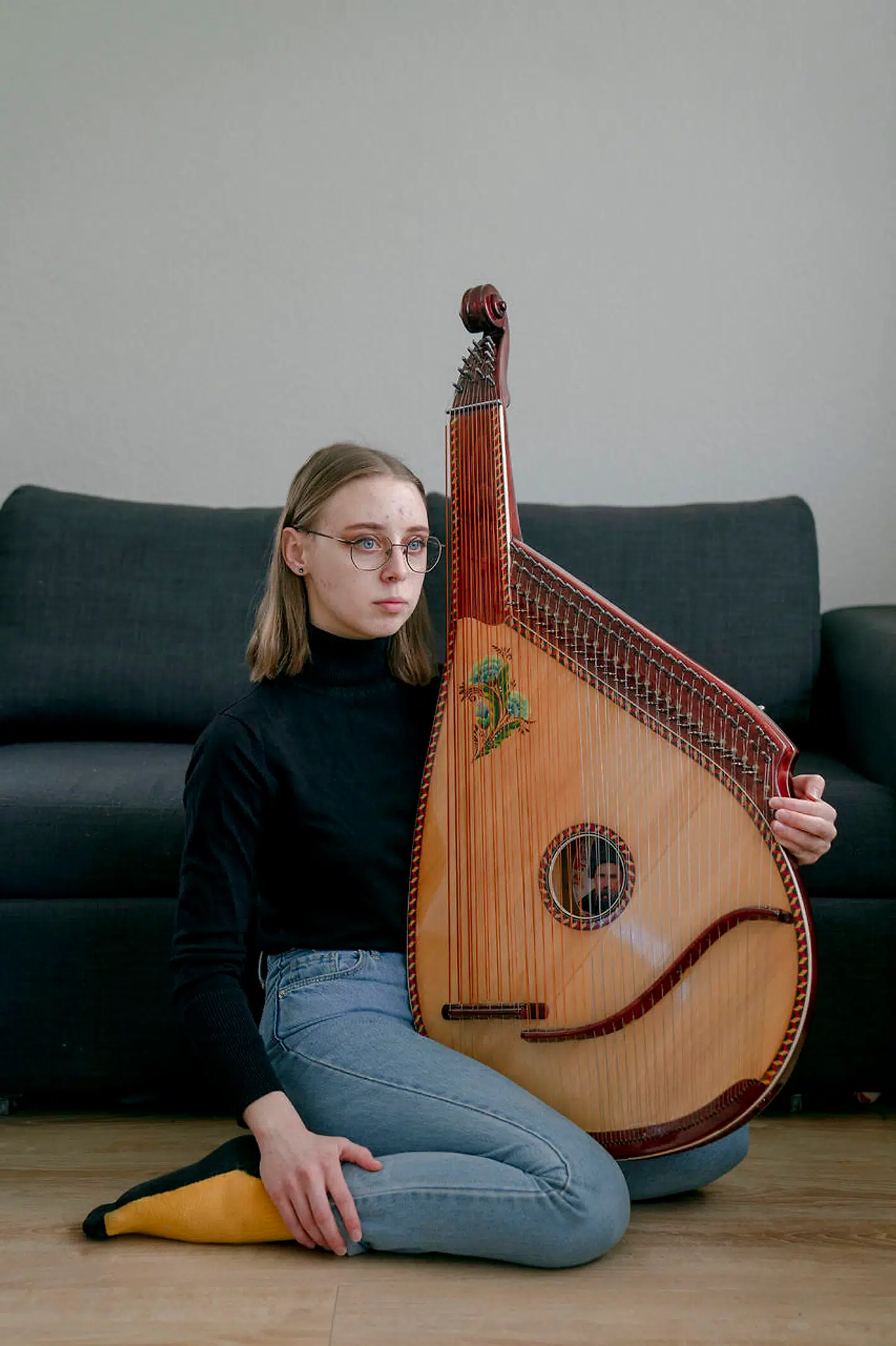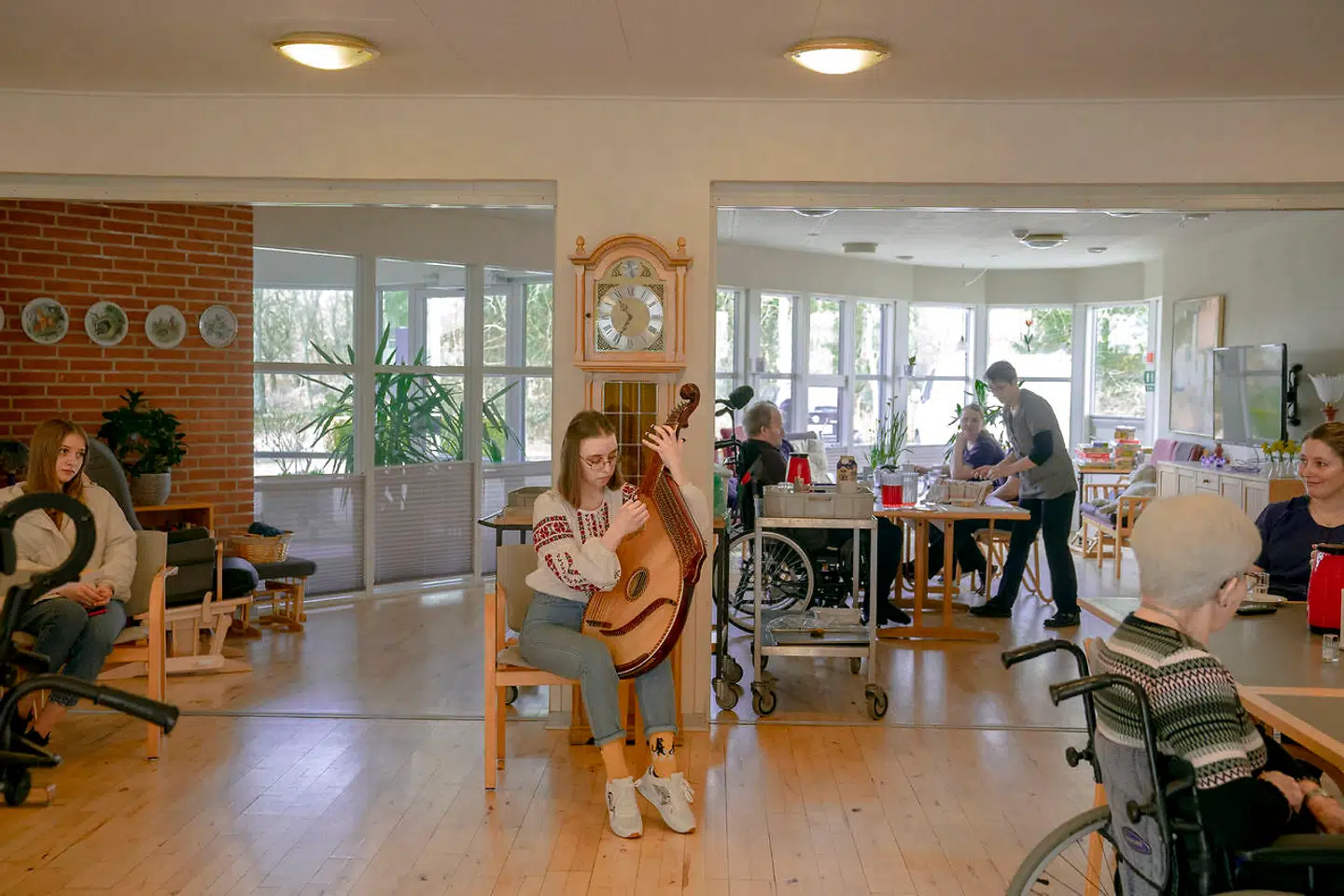 20-årige Anastasiia Kyshkovska spiller den ukrainske nationalmelodi på plejehjemmet i den vestjyske by Borris. Instrumentet er en bandura – et ukrainsk folkeinstrument. Anastasiia går på musikkonservatoriet i Kyiv og flygtede til Danmark med sin søster og kusine.