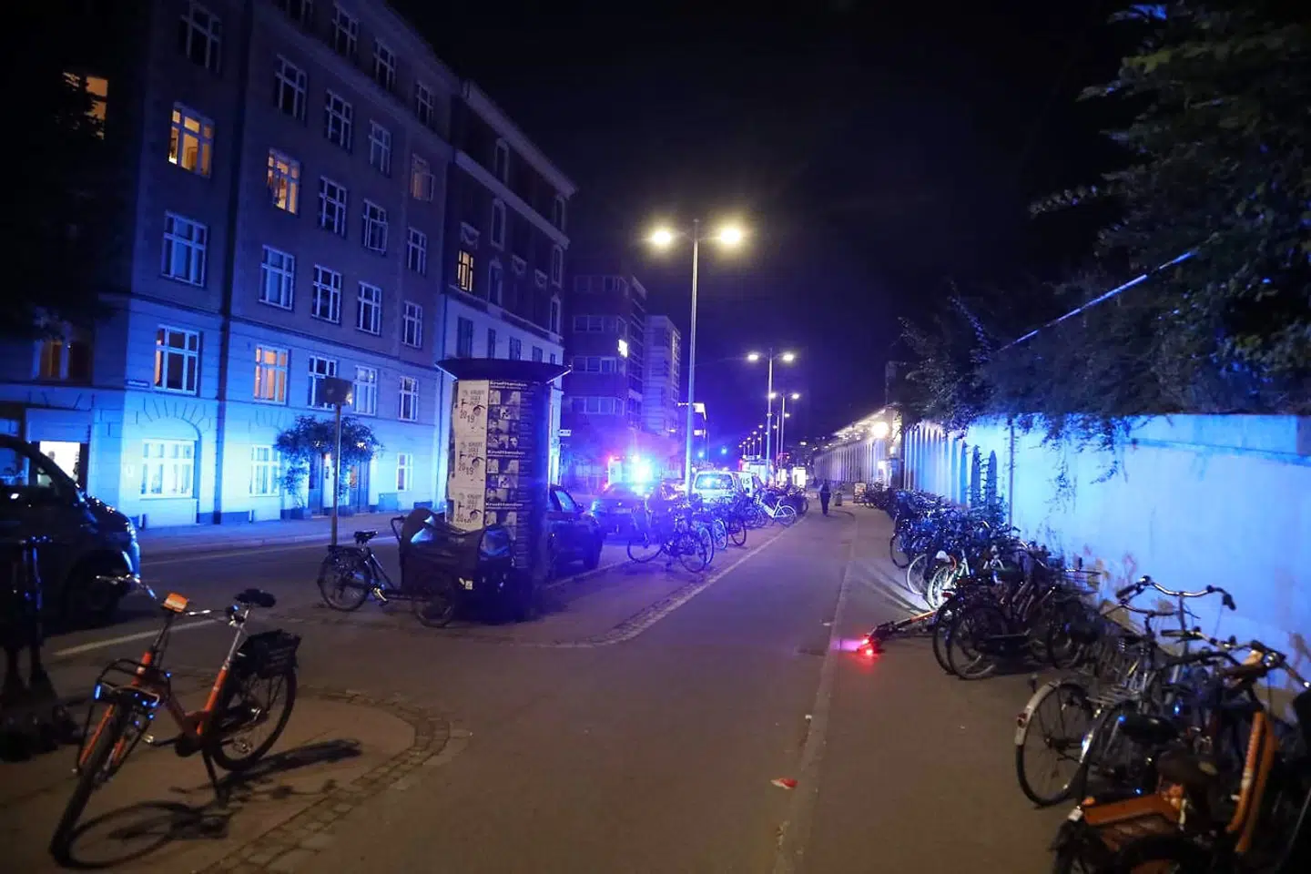 Politiet har afspærret bygningen, så det ikke er muligt at komme tæt på indgangspartiet. Det er muligt at passere bygningen langs Østbanegade.