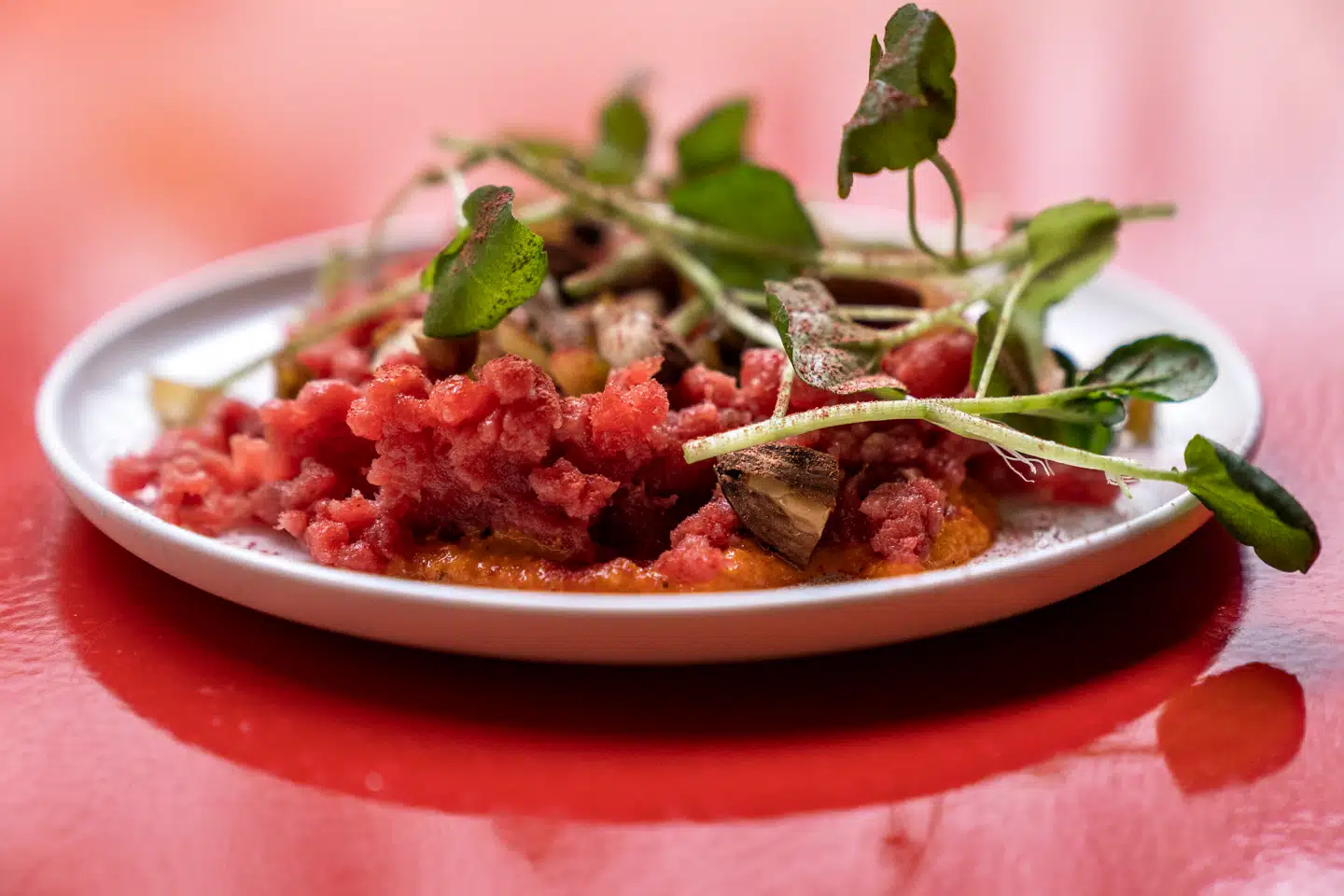 »Tataren var lavet på oksekød fra Grambogård, og som jeg foretrækker det, var den skrabet og ikke hakket. Underneden lå en romescosauce på røde peberfrugter, hvidløg og mandler, som fik et pikant pift af røget spicyness fra den baskiske chilipeber piment d’Espelette.«