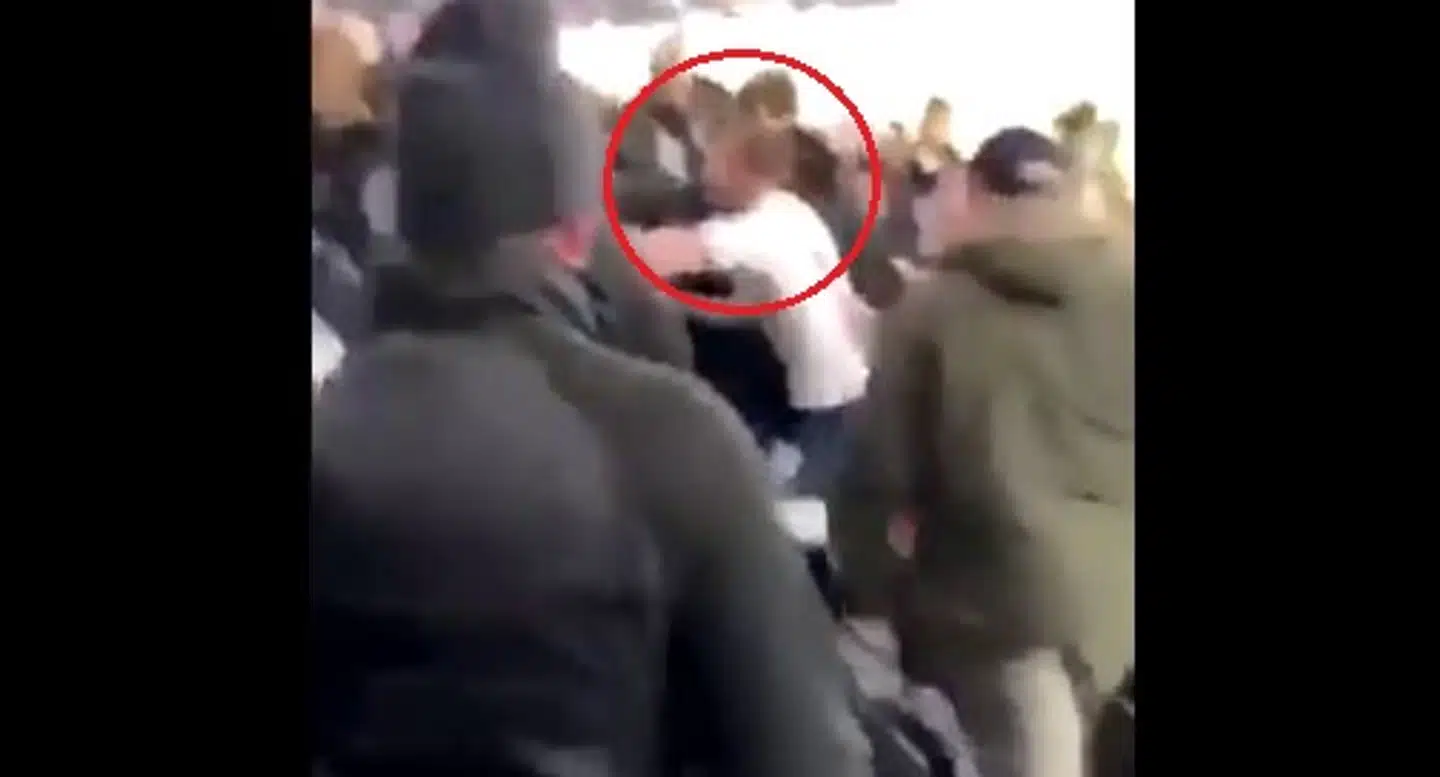 En større gruppe mennesker samler sig om Tottenhams midtbanespiller, der står midt i et skænderi, mens sikkerhedsvagter kommer til for at skille dem ad og føre Eric Dier væk.