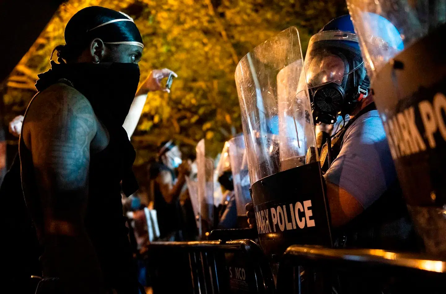 Med udsigt til Det Hvide Hus og en række betjente i fuld udrustning foran sig råbte demonstranterne ikke længere kun taktfast »Black Lives Matter« og »skyd ikke« hen mod betjentene.