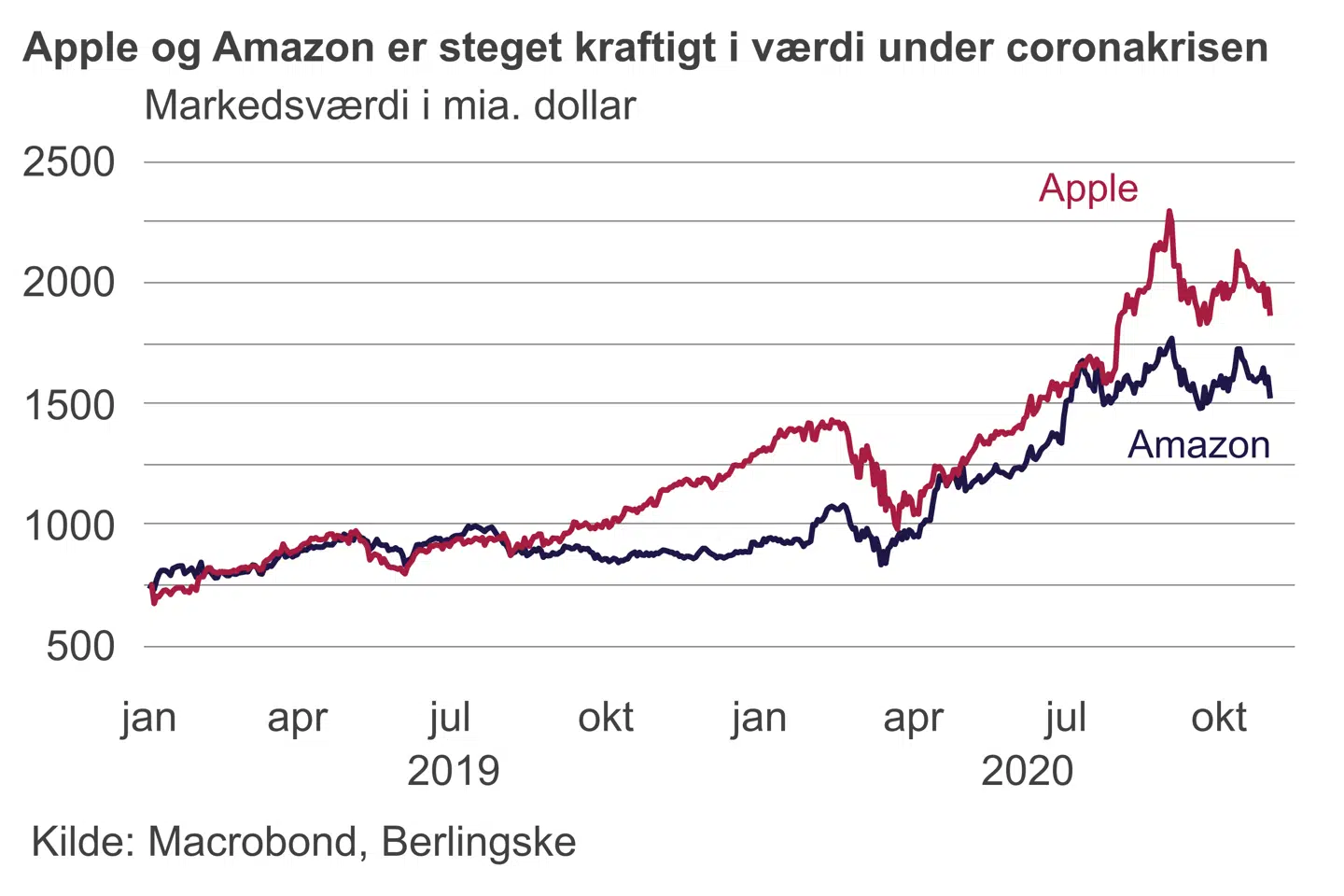 Mens Apple-aktien er steget med mere omkring 50 procent siden årsskiftet, er Amazon-aktien steget med over 60 procent. De kraftige kursstigninger gør, at begge selskaber nu har en markedsværdi på et godt stykke over 1.000 milliarder dollar.