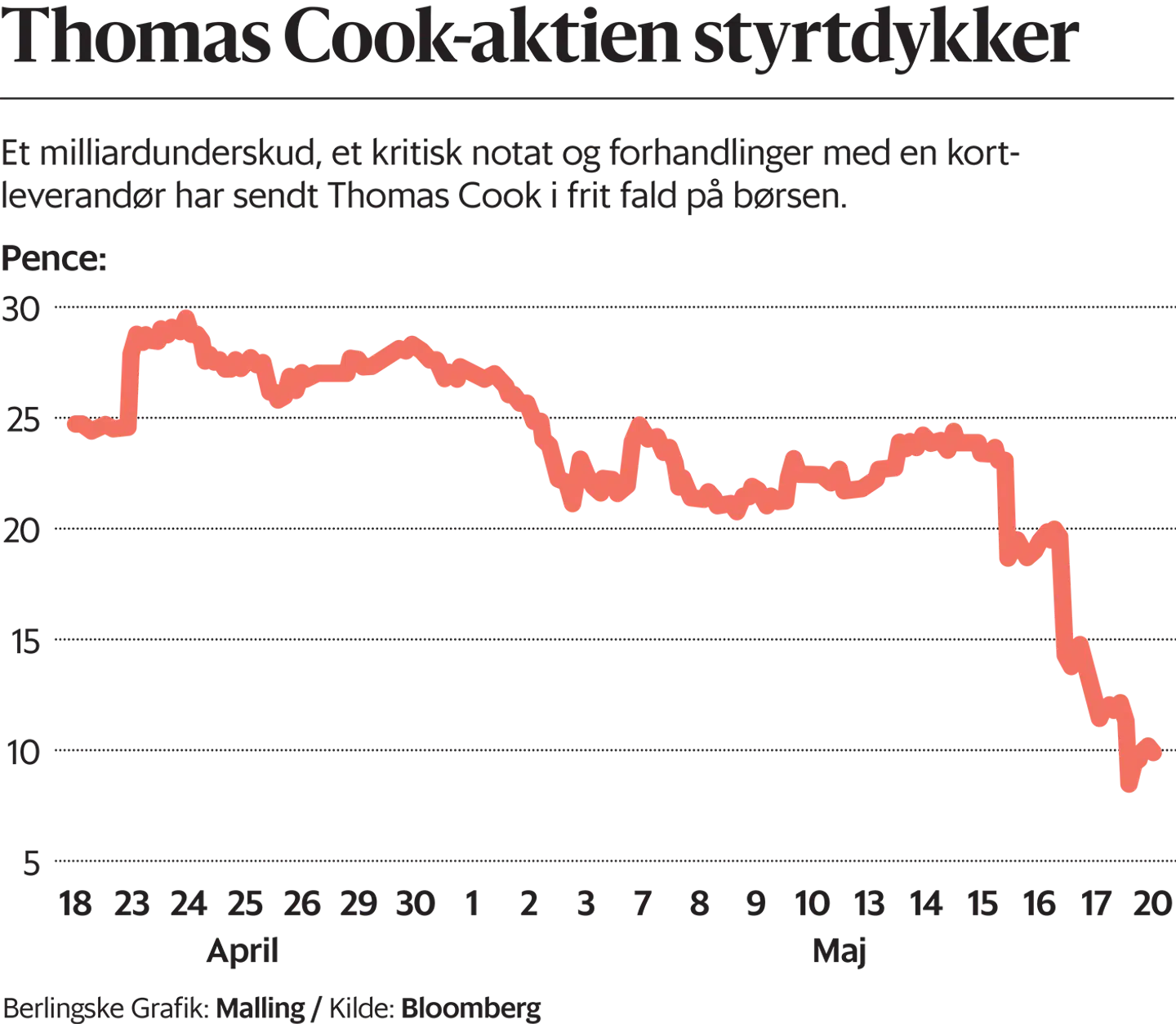 Fredag morgen ligger aktiekursen for Thomas Cook stadig i bundlinjen. Torsdag steg kursen dog en smule med omkring to pct., men virksomheden mødte yderligere pres på kontoen, efter kreditrangeringsbureauerne Fitch og S&P betegnede aktierne som værende »junk«, skriver The Guardian.
